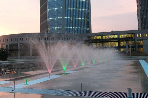旱式喷泉:放置在地下,表面饰以光滑美丽的石材,可铺设成各种图案和造型。当音乐响起时,水花从地下喷涌而出,在彩灯照射下,地面尤如五颜六色的镜面,将空中飞舞的水花映衬得无比娇艳,使人流连往返。停喷后,不阻碍交通,可照常行人,非常适合于宾馆、饭店、商场、大厦、街景小区等。